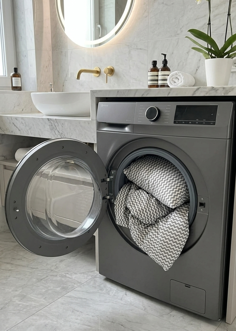 Waschen Sie Bettwäsche auf links, mit Buntwaschmittel, bei 40°C und getrennt von anderen Textilien.