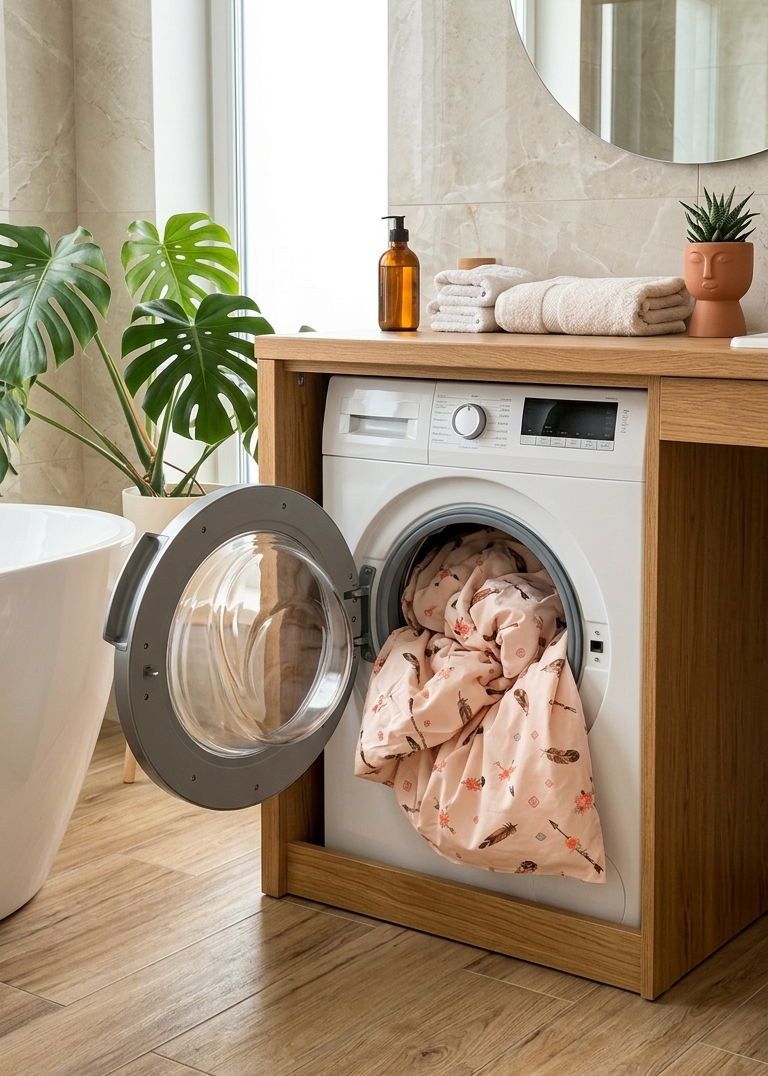 Waschen Sie Bettwäsche auf links, mit Buntwaschmittel, bei 40°C und getrennt von anderen Textilien.